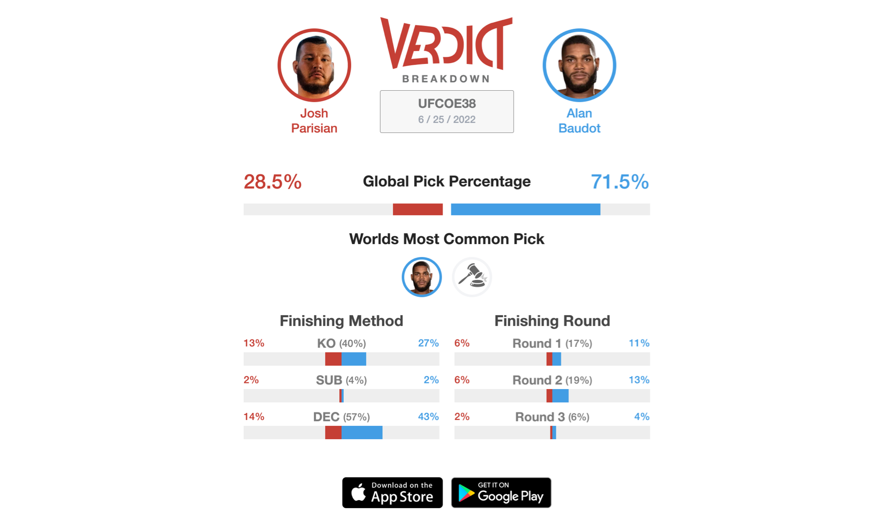 On Baudot's end, expect a more in and out approach consisting of the left hook, right overhand, and lots of bouncing. Between the two, Parisian is a much slower starter and requires time to accelerate, whereas Baudot likes to start guns a-blazing, sometimes to his detriment. Hopefully, we get a typical heavy-handed KO here, however, the Verdict Community expects Alan Baudot to pick up a decision victory.