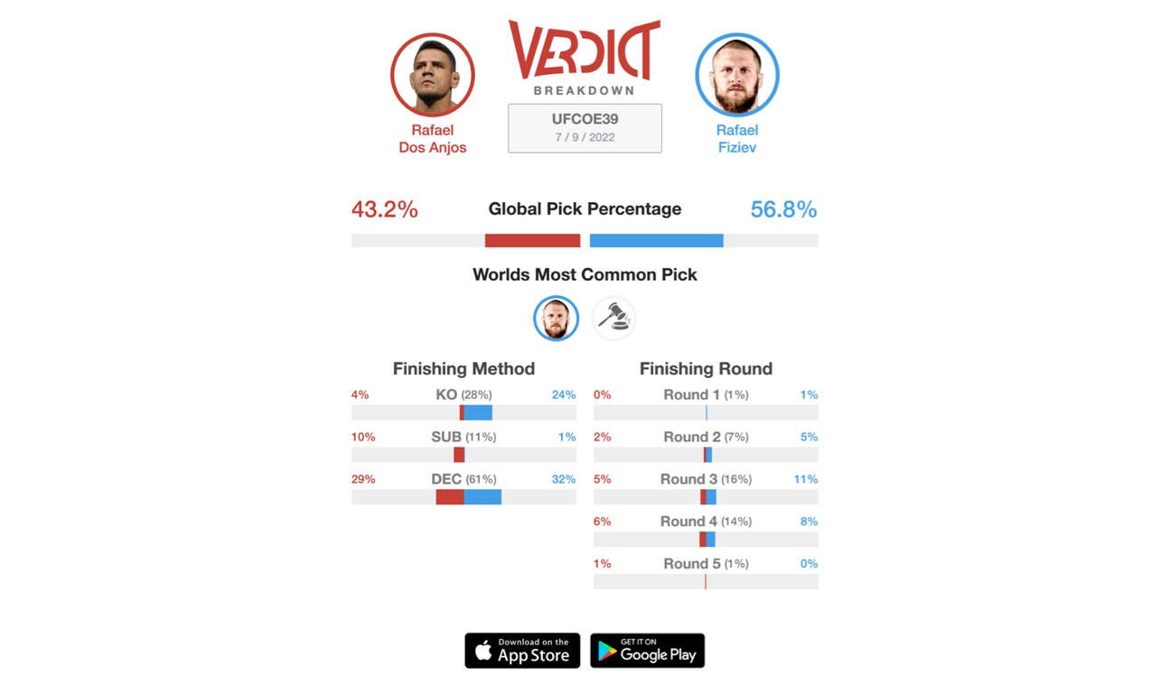 Fiziev has a very decorated background in muay thai. Training at one of the best gyms in the world, Tiger Muay Thai, Fiziev always looks for the finish on the feet. The body kicks and attacks from Fiziev is what separates his striking from others. His takedown defense is at a resounding 95%, but that'll be put to the test against Dos Anjos. Even though he can hold his own on the feet, Dos Anjos has the ability to take his opponents into places they are not comfortable. Having a black belt in Brazilian jiu-jitsu, Dos Anjos can add another submission win to his resume against one of the top rising contenders in the division. Where it stands now, nearly 57% of the Verdict Community is predicting Fiziev to defeat Dos Anjos at UFC Vegas 58.