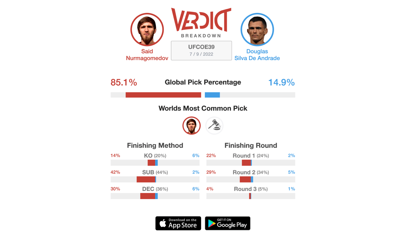 It's the classic veteran versus prospect matchup as Douglas Silva de Andrade faces Said Nurmagomedov. In this fan-friendly fight, both fighters are known to finish fights. Silva de Andrade has a 78% finish rate while 20 of his 28 wins are coming by way of knockout. Silva de Andrade is on a two-fight winning streak with his most recent win at UFC 271 whe he defeated Sergey Morozov via submission. He likes to keep it on the feet as Silva de Andrade has knockout power in both hands. He's a crisp boxer that looks for those big shots to end the fight early. On the other side, this is not your typical Nurmagomedov fighter. Said Nurmagomedov is more of a pure striker than he is a wrestler. He does have the ability to have sucess on the ground, but Nurmagomedov likes to push the pace with his striking attacks. Many are anticipating this fight to stay on the feet but in the case that it does go to the ground, that is where it can get interesting. Where it stands now, 85% of the Verdict Community predicts Nurmagomedov will defeat Silva de Andrade in what could be the fight of the night.