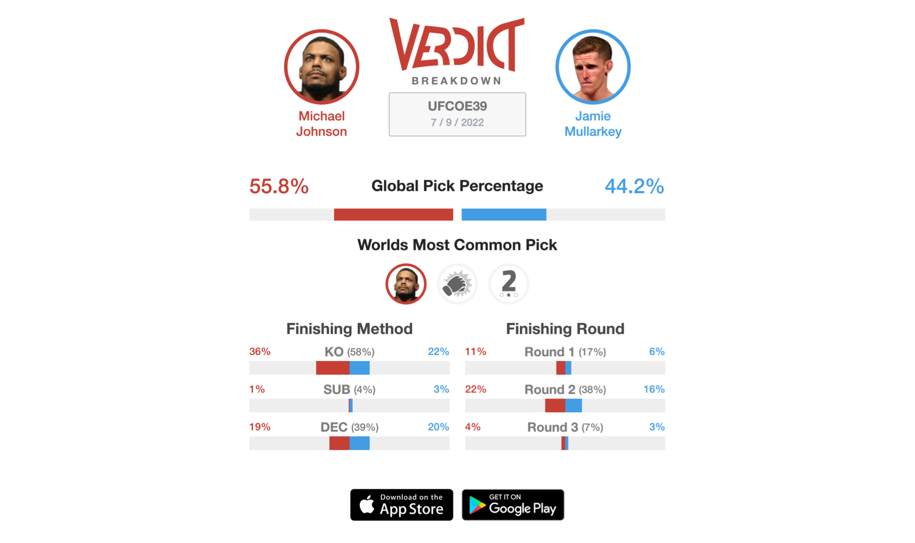 In another veteran verus prospect matchup, Michael Johnson will try to put on another gutsy performance as he takes on Jamie Mullarkey. Johnson is returning to the octagon after fighting a couple of months ago when he defeated Alan Patrick via knockout in the second round. In what was the most important win of his career, he'll try to double it up this weekend. Johnson has a professional record of 20-17, but he has some notable wins throughout his tenure. A few of these impressive wins have been agaisnt the likes of Dustin Poirier, Edson Barboza, Tony Ferguson, and more. On the flip side, Mullarkey is looking to bounce back after suffering a defeat against Jalin Turner at UFC 272. With a professional record of 14-5, Mullarkey has a 93% finish rate in his career. Mullarkey is known for being a striker but he is no stranger in taking the fight to the ground. He averages over three takedowns per fight and has a strong ground game to go with it. Mullarkey likes to keep the fight at a high pace and he has the perfect opponent to do it with. This fight should be fun for as long as it goes on for. Where it stands now, nearly 56% of the Verdict Community are predicting Johnson to upset Mullarkey at UFC Vegas 58. The most common pick is for Johnson to win by a second round knockout too.
