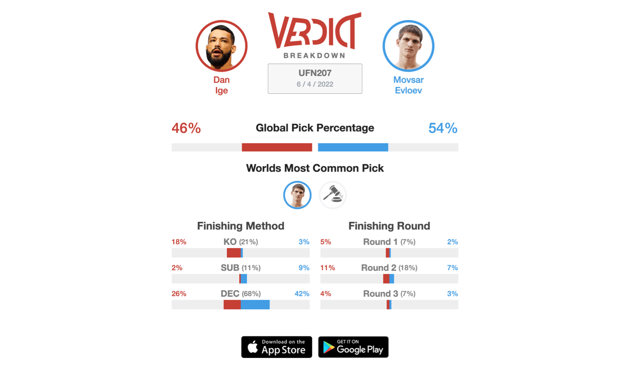 The fight that has all the potential to be Fight of the Night on Saturday is Dan Ige going against Movsar Evloev. Ige is looking to get back into the win column as he lost his last fight back at UFC 269 against Josh Emmett via decision. Ige possesses great power, especially in the Featherweight division, and lands at a high volume. His 55% takedown defense will be tested as Evloev is one of the best prospects the UFC has in the Featherweight division. With an average of four takedowns per fight, Evloev provides a non-stop wrestling pace to overwhelm his opponents. While training at American Top Team, he has improved his striking abilities, making it a problem for most of his opponents. The undefeated prospect looks to emerge as a real contender in the Featherweight division with a win over Ige. As of now, 54% of the Verdict Community predicts that Evloev will remain undefeated at UFC Vegas 56.