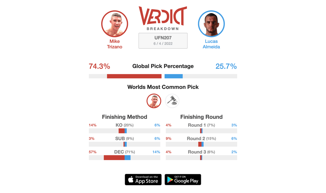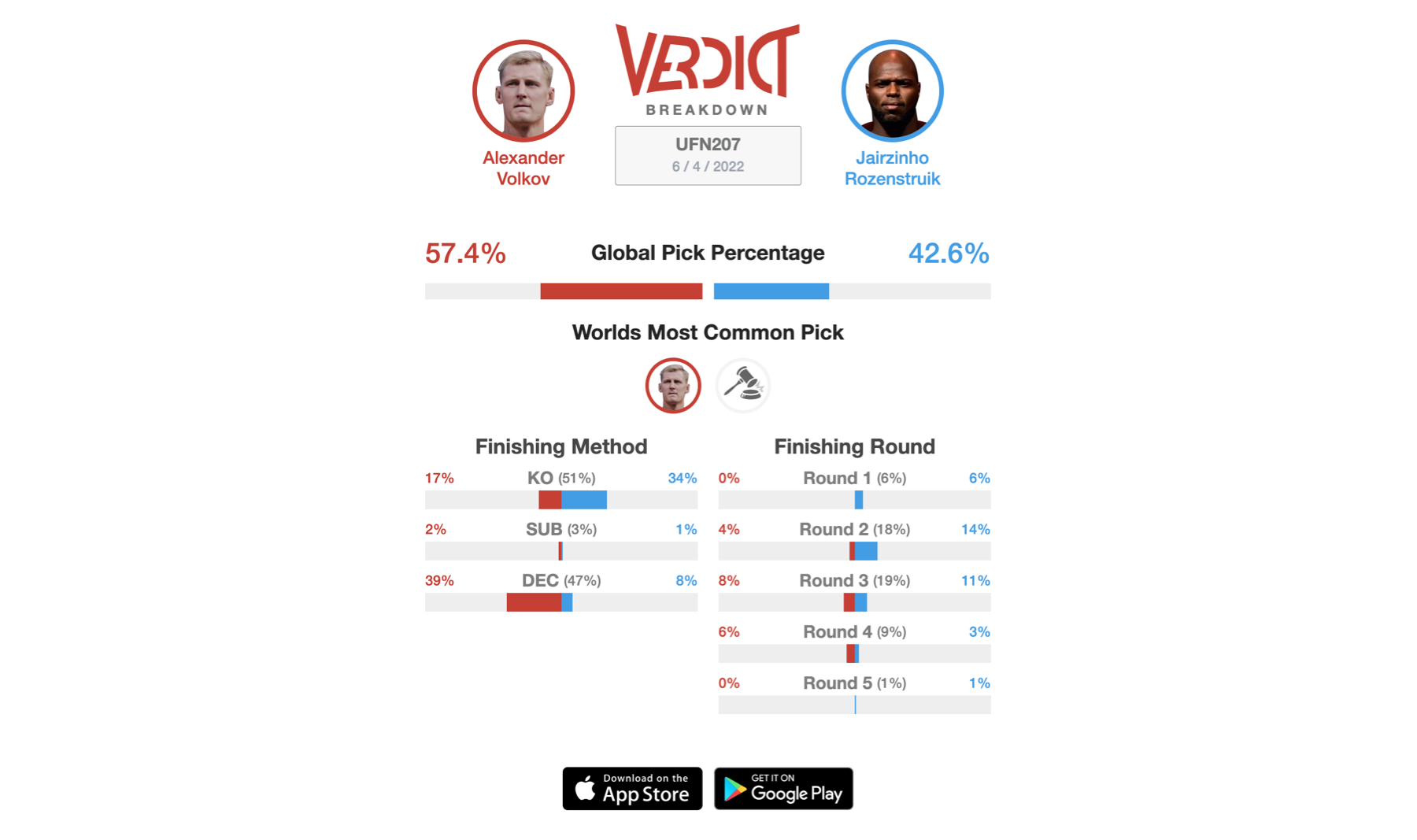 In a crucial Heavyweight fight, Alexander Volkov and Jairzinho Rozenstruik are looking to bounce back after losing their last fight and get back into the top five conversation. It'll be a quick turnaround for Volkov as he lost to Tom Aspinall via submission in March of this year. Volkov is known for his size and length in the Heavyweight division as he poses a unique challenge for all of his opponents. In terms of his fighting style, Volkov is not your typical Heavyweight fighter. With an average fight time of over 14 minutes, Volkov likes to pick his shots on the outside while being patient. As of now, the Verdict Community is taking the side of Volkov at 57.4% to defeat Rozenstruik. However, it may be closer than what many think. Rozenstruik is coming off a decision loss against Curtis Blaydes back at UFC 266. While having some good moments in that fight, it was the takedown defense that ultimately failed him in the loss. This will not be the case this weekend as the fight will take place on the feet between two strikers. Rozenstruik is known for his kickboxing abilities and his explosive bursts. He has finished 11 of his 12 wins in his career and the most common pick for Rozenstruik to win in the Verdict Community is by knockout at 34%. In a fight that is key for both men, a victory can have one of them knocking on the door for a top-five opponent next to get back into the title picture.
