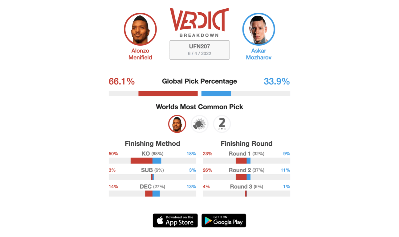 A Light Heavyweight fight between Alonzo Menifield and Askar Mozharov will take place on Saturday and it has a great chance of it not going to the judges. Menifield makes the walk to the Octagon for the first time this year after losing to William Knight by decision in December. With a 90% finish rate, Menifield looks to get back on track against Mozharov, who is making his UFC debut. Menifield has finished fighters like Paul Craig, Fabio Cherant, and more. On the other side, Mozharov is no stranger to finishing fights as he has a 90% finishing rate as well. With a professional record of 21-8, Mozharov has only seen the judges' scorecards twice, in which he won both times. Where it stands now, 66.1% of the Verdict Community is predicting Menifield to spoil the debut of Mozharov.