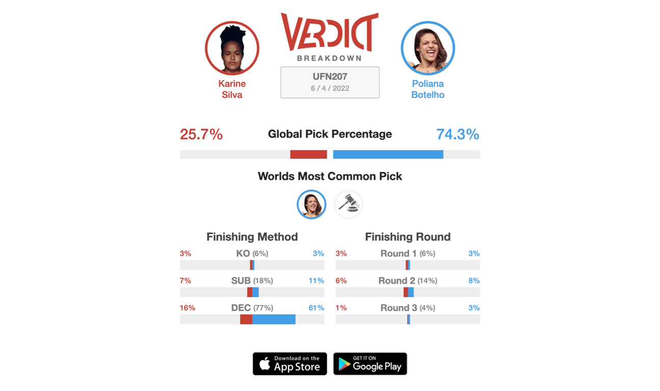Karine Silva is one of the most interesting fighters that will be showcased on Saturday as she makes her UFC debut against Poliana Botelho. Silva just won on the Dana White Contender Series last year in October, earning herself a UFC contract. Silva put on an impressive performance with her BJJ as she nearly won on a gogoplata submission. Instead, she locked in a guillotine choke in the second round. With a professional record of 14-4, Silva has a finish rate of 100% and will try to keep that streak alive when she takes on Botelho. At 75%, the Verdict Community predicts that she will spoil the debut of Silva and earn the victory. Botelho is coming off two straight decision losses and is need of a win. Six of her eight wins are by KO/TKO, but Botelho does have the ability to go the distance and win. The world's most common pick in the Verdict Community is Botelho to win by decision.