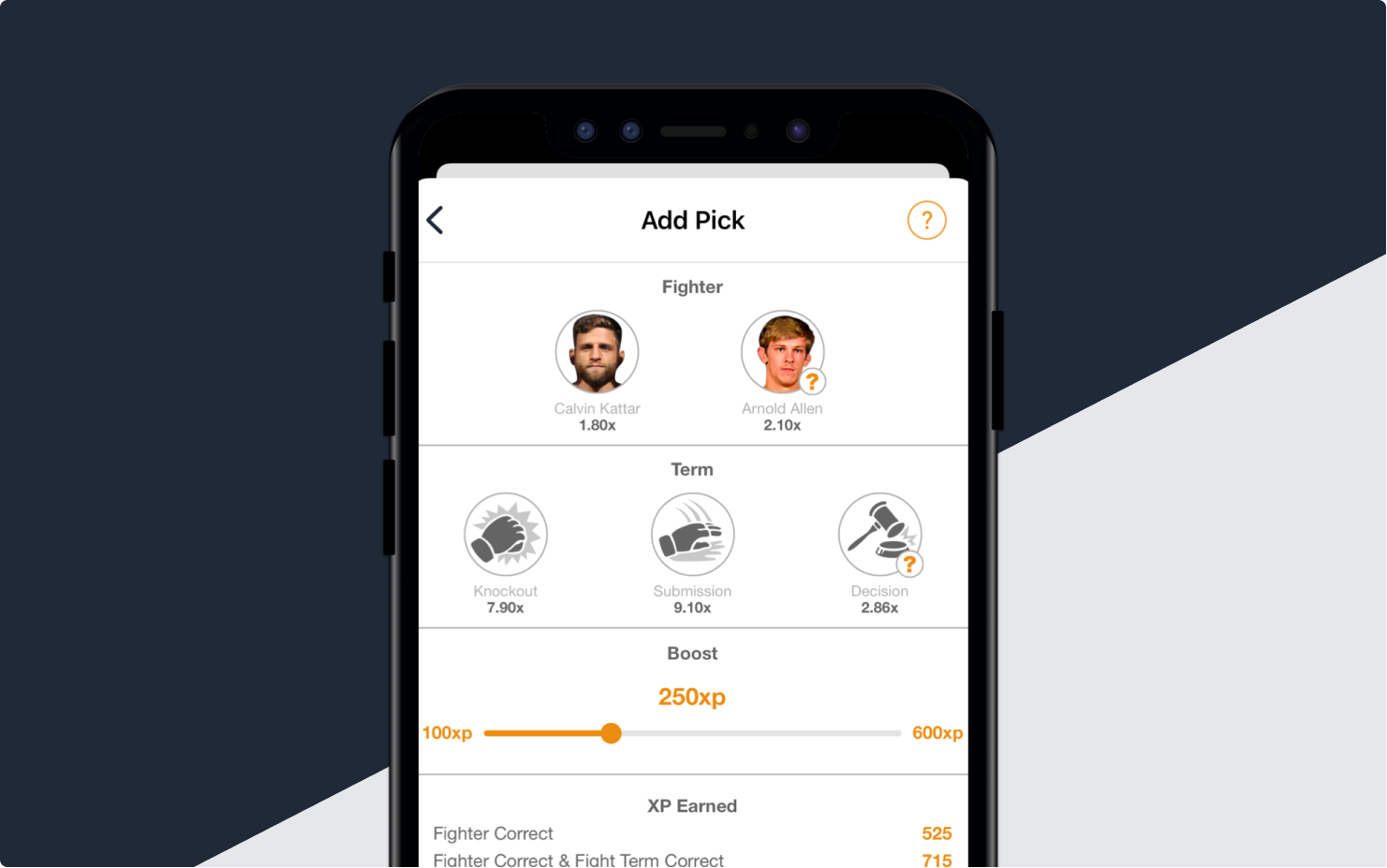 It's just as simple as that, all you have to do is simply predict the winner and their method of victory. You choose the fighter and predict if they will by knockout, submission or decision and in what round. You gain what's called XP for a correct prediction, and with those XP you can allocate how much you want for each particular fight.